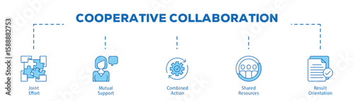 Cooperative Collaboration infographic icon bluetone flow process which consists of Joint Effort, Mutual Support, Combined Action, Shared Resources, Result Orientation.