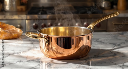 Copper Saucepan with Gold Handle Steaming on Marble Countertop