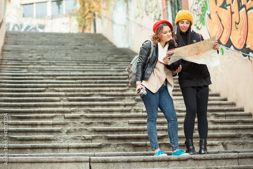 coppia di amiche in viaggio controlla la mappa in un scalinata mentre decidono dove andare