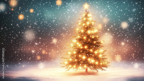 Copy Space Banner: Shiny Christmas Tree with Glowing Lights on Blurred Winter Background