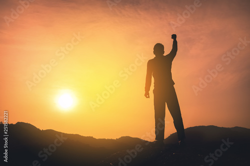 Copy space of man rise hand up on top of mountain and sunset sky abstract background.