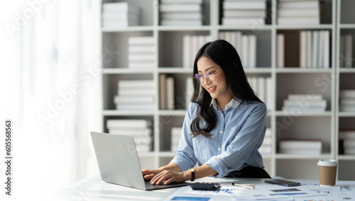 copy space, panorama, banner Modern working lifestyle Asian businesswoman sits at desk with laptop online using internet and notepad happily recording receipt contact information online delivery.
