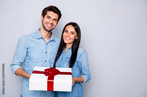 Copyspace photo of two people together loving each other presenting you gift wearing jeans denim isolated over white grey color background