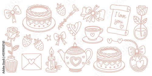 Coquette Elements for Valentine's Day, Wedding, and Birthday Cards – Vintage Cute Bows, Hearts, Ribbons, Strawberries, Cake, Cherries, and Romantic Heart Frame Illustrations