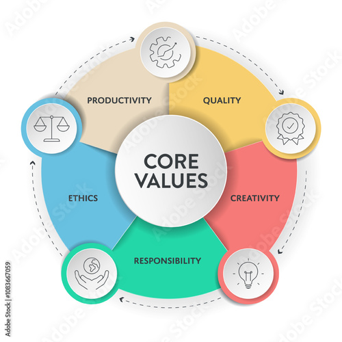 Core Values strategy model infographics diagram chart illustration banner with icon vector has quality, creativity, responsibility, ethics, productivity. Presentation slide template. Business concept.