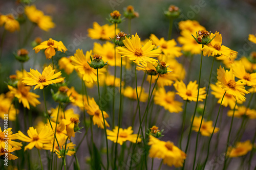 Coreopsis flowers on a summer sunny day on the lawn. Annuals plants. Bright picture. Unpretentious flowers for garden