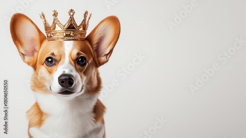 Corgi dog proudly wearing a gold crown, exuding royal charm against a clean white background in this delightful moment of canine majesty