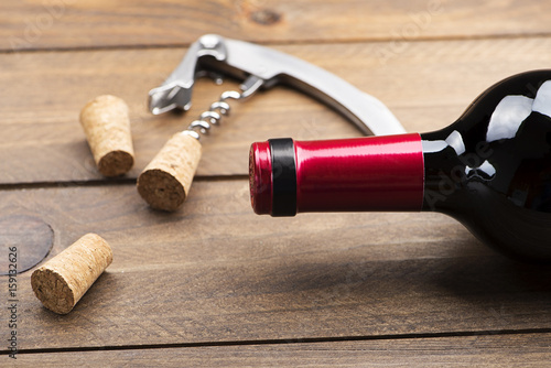 Corkscrew next to several corks and a bottle of wine on wooden table. Horizontal studio shot.