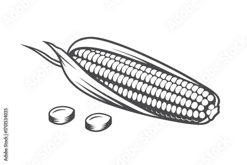 vector, white background, corn, maize, kernel, husk, agriculture, food, harvest, vegetable, ingredient, healthy, vegetarian, vegan, crop, cob, plant, organic, raw, fresh, nature, farm, field, diet, nourishment, natural, cooking, meal, produce, botanical, growth, season, autumn, outline, symbol, monochrome, line art