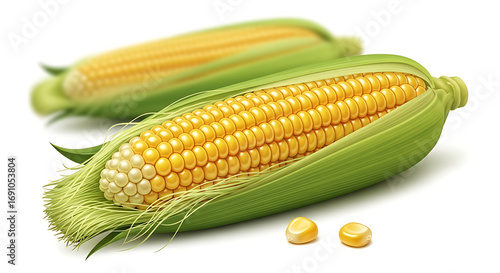 corn, maize, corn on the cob, vegetable, food, produce, healthy, yellow, green, husk, kernel, seed, agriculture, harvest, farm, farming, crop, plant, organic, fresh, raw, nature, healthy eating, diet, ingredient, summer, illustration, drawing, graphic, render, isolated, studio shot, nobody, ripe, alimentary, sweet, delicious