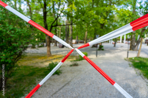 corona, virus, blocked, beer garden, gastronomy, blocking, closed, tree, outside, park, crisis, excursion, munich, bavarian, recreation, beer, enjoyment, red, white, blank, local, enjoy, spring, summer