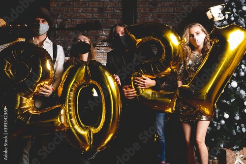 Corona virus pandemic. Party, people and new year holidays concept - women and men in protective medical mask celebrating new years eve 2021