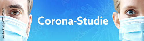 Corona-Studie. Gesichter von Mann und Frau mit Mundschutz. Paar mit Maske vor blauen Hintergrund mit Text. Virus, Atemmaske, Corona