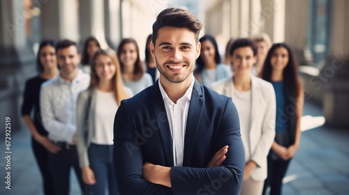Corporate Confidence: Young Smiling Businessman with His Team in the Background. Generative ai