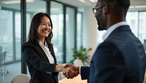 Corporate Diversity East Asian Businesswoman and Black Businessman Shaking Hands in Executive Office
