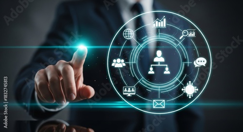 Corporate HR Dashboard HUD with User Hierarchy and Analytics Icons — Business