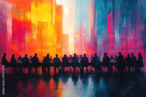 corporate meeting reimagined as an abstract blur of motion and color impressionistic style captures the energy and dynamics of business interaction without distinct figures