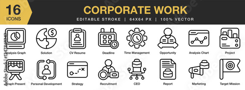 Corporate Work icon set. Editable Stroke Icon Collection. Includes work, business, corporate, professional, people, and More. Outline icons vector collection.