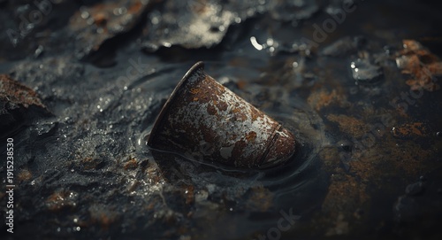 Corroded cup lying in water thick with environmental contaminants
