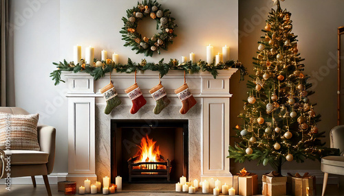 christmas, chimney, tree, room, house, insides, decoration, vacation, christmas tree, fire, light, family, celebration, winter, living room, santa, gift, decoration, ornament, indoor, window, spark plug