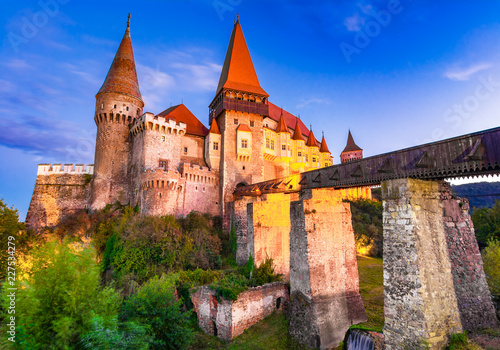 Corvin Castle or Hunyad, Hunedoara, Romania: Night view of the Corvin's Castle in the sunset lights, Hunedoara, Transylvania, Romania, Europe