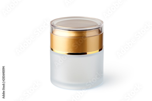 Cosmetic glass jar with golden lid isolated on white background. Skin care bottles for gel, lotion, cream.