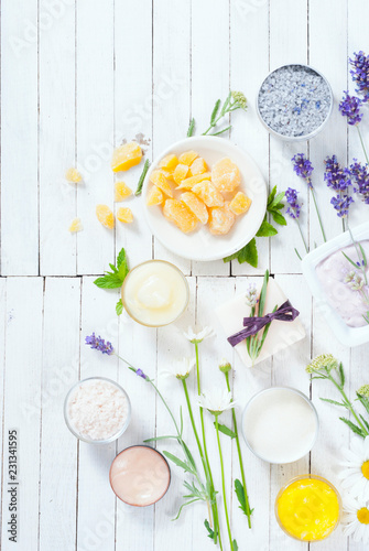 moisturiser, bath salt, soap, hand cream, face cream, lavandula, chamomile, mint, yarrow, flower, bud, leaf, herb, lotion, ointment, bowl, glasses, creamer, beauty product, sample, skincare, bodycare, swirl, pink, purple, white, bright, blue, green, beige, yellow, shade, toiletry, rustic, table, pattern, striped, texture, wooden, wood, copy space, up high, topview, vertical