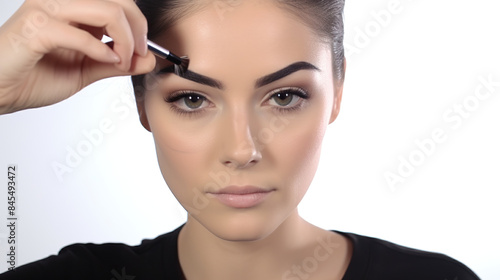 Cosmetics artist using brush to apply liquid eyeliner isolated against background