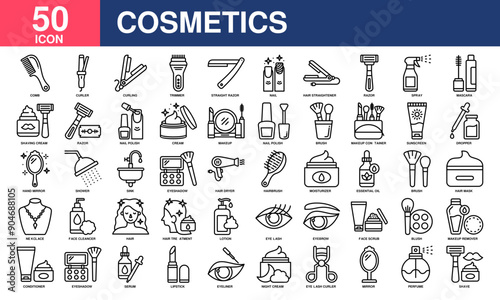 Cosmetics icon collection set. Containing makeup, beauty, skincare, makeup equipment, beauty and cosmetics, beauty treatment, makeup tool icon. Simple line vector.
