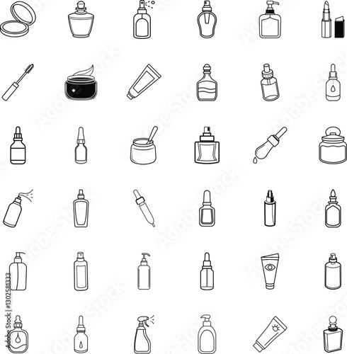 cosmetic, skincare, beauty, product, bottle, container, cardboard box, jar, tube, icon, design, illustration, graphic, vector, make-up, cream, lotion, serum, oil, spray, pump, dropper, applicator, container, beauty product, bottle, jar, tube, compact, mascara, lipstick, foundation, toner, cleanser, moisturiser, hand cream, sunblock, perfume, fragrance, cosmetic, line art, black-and-white