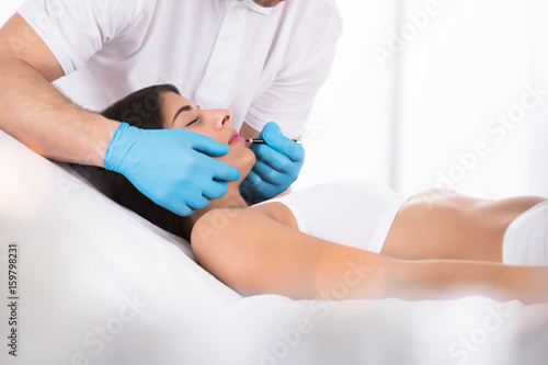 permanent, facial, skin, beauty, beautician, salon, treatment, cosmetologist, applying, constructed, tattoo, spa, machine, lip, medicals, woman, face, cosmetic, hand, apply