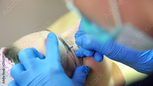 cosmetologist, applying, permanent, tattooed, eyebrow, beauty, salon, closeup, workflow, make-up, wellness, health care, caucasian, protective, mask, beautiful, glamour, care, instrument, needle, procedure, ink, glove, cosmetic, performing, model, woman, professional, cosmetician, cosmetology, face, female, hand, lifestyle, skin, tool, treatment, machine, tint, henna, blond, fashion, clinic, medicals, specialist, facial, head, correction, modern