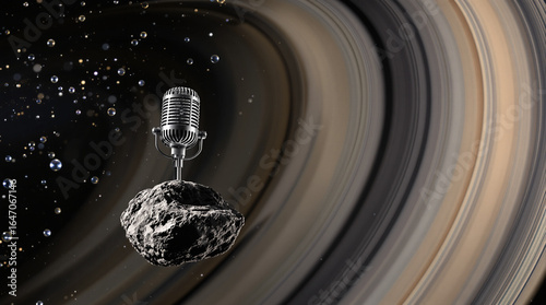 Cosmic Broadcast: Vintage Microphone on a Drifting Asteroid in the Vast Expanse of Space, Framed by a Majestic Ringed Planet