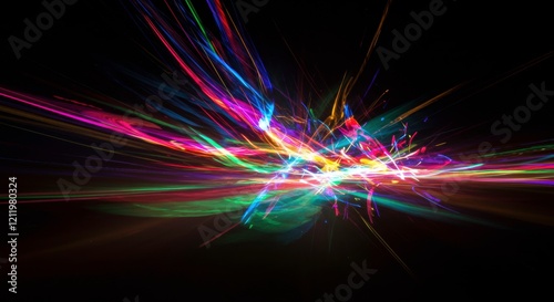 Cosmic Burst of Color: A vibrant explosion of rainbow hues against a deep black backdrop creates a mesmerizing spectacle of abstract art, evoking energy, creativity.