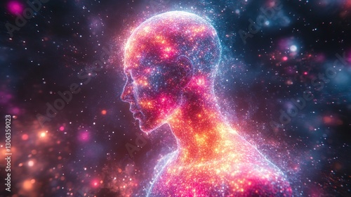 human, cosmos, universe, star, space, galaxy, nebula, energy, light, glow, spiritual, mystical, abstract, digital, art, design, imagination, fantasy, dream, cosmic, consciousness, profile, head, body, form, particle, glistering, sparkle, vibrant, colours, pink, purple, blue, red, orange, night, dark, illustration, artwork, creation