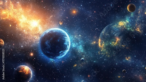 Cosmic Dance: Celestial Bodies in a Vibrant Nebula