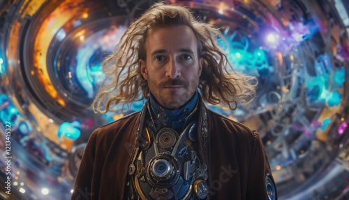 futuristic, eccentric, science fiction, galaxy, cosmic, explorer, advanced, technology, interstellar, swirling, blond, hair, space, traveler, colourful, background, mechanical, high technology, outfit, glowing, time, element, man, light, vortex, adventure, vibrant, galactic, scenery, mechanism, hero, suit, energy, space-time, engineering, component, exploration, portrait, art, mechanic, intergalactic, swirl, design, character, wallpaper