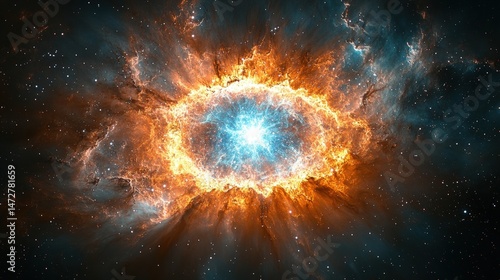 nebula, explosion, cosmic, space, galaxy, star, fire, energy, light, bright, vibrant, colours, orange, blue, dark, celestial, universe, cosmos, stunning, digital, artwork, graphic, design, illustration, art, fiery, aglow, center, ring, swirl, pattern, texture, colourful, artistic