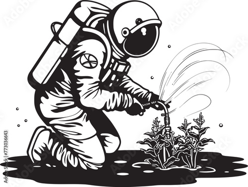 astronaut, watering, plant, vector, graphic, illustration, space, science, exploration, cosmic, galaxy, universe, adventure, helmet, suit, technology, future, mission, astral, botany, growth, science fiction, star, orbit, vector graphics, space exploration