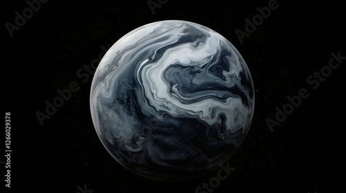 Cosmic Marble: A captivating celestial sphere, reminiscent of a swirling marble, shimmers with intricate patterns of grey and white, suspended against a vast black void.
