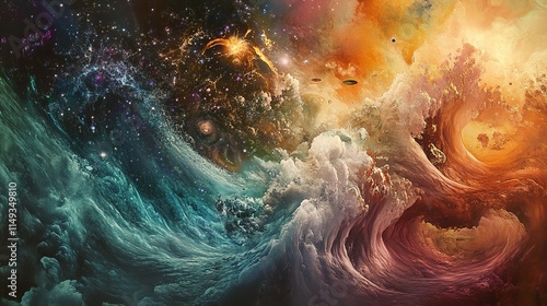 space, wave, ocean, cosmos, universe, galaxy, nebula, star, water, cosmic, abstract, art, digital, painting, surreal, fantasy, dreamlike, whirlpool, celestial, energy, power, nature, colours, texture, light, dark, chaos, harmony, balance, movement, flow, dynamic, vibrant, intense, mystical, spiritual, aethereal, infinite, huge, grand, awe, wonder, beauty, sublime, turbulence, serenity, contrast, depth