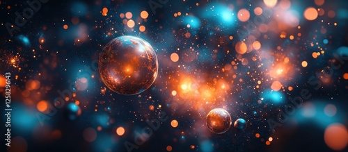 Cosmic spheres float in vibrant nebula; bokeh background; ideal for design