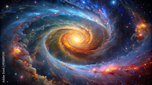 Cosmic vortex of swirling gas and stars forms a spiral shape, surrounded by vibrant nebulae and celestial bodies in a mesmerizing astronomical scene.