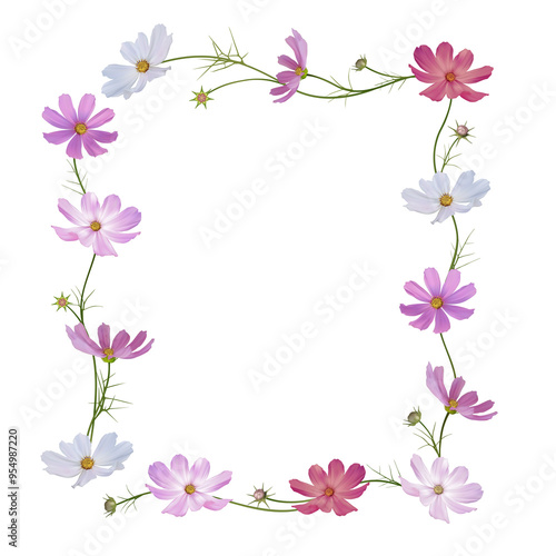 Cosmos flower. Wild flowers. Frame decorated with flowers on a white background. Pink. Purple. White. Mexican aster. Blooming. Isolated.