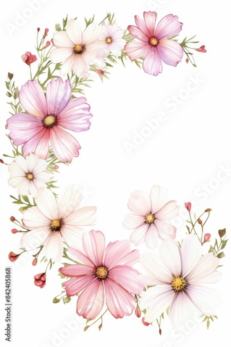 cosmos themed frame or border for photos . delicate pink and white flowers. watercolor illustration, white color background.