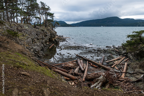 cost line on the edge of the island with dense forest on one side and drift wood covered beach on the other under cloudy sky