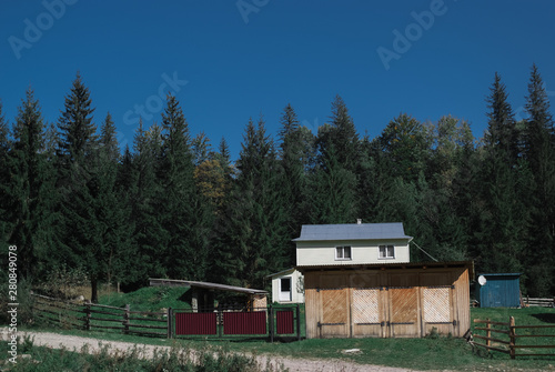 Cotage and the beautiful scenic forests on sky background in Carpathian Mountains, Ukraine