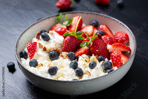 Cottage cheese, curd cheese with fresh strawberries, blueberries, nuts and yogurt in a bowl. Healthy dairy product rich in calcium and protein.