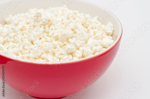 Cottage cheese in red bowl isolated on white. Valuable healthy m
