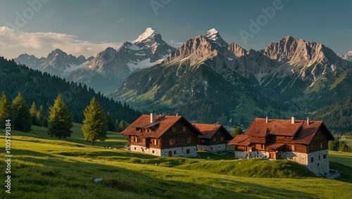 mountain, landscape, house, alps, nature, sky, mountain, grass, alpine, hut, forest, summer, village, meadow, green, building, barn, austria, vale, view, rural, tree, farm, switzerland, europa